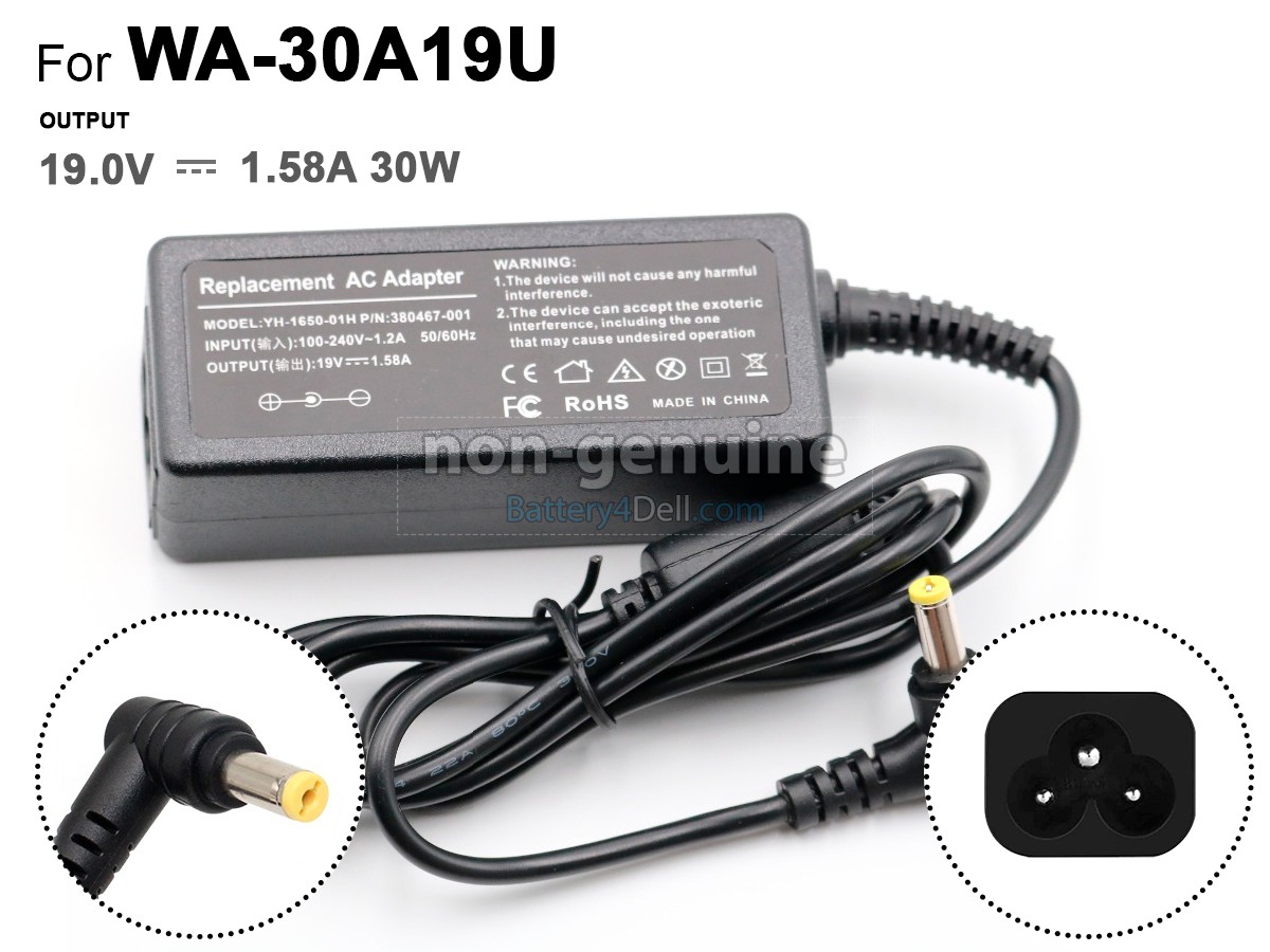 The Dell 30W 19V-1.58A yellow adapter sold by Battery4Dell is a high-quality replacement product, not an original one. We mention Dell's brand and model only to illustrate adapter compatibility for customers to identify.